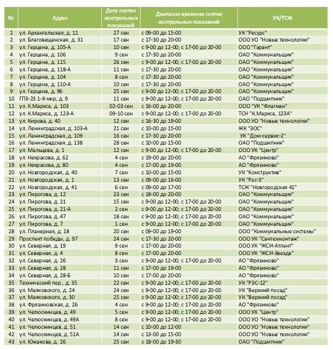 График обхода многоквартирных домов для снятия контрольных показаний индивидуальных приборов учета в сентябре 2025 года